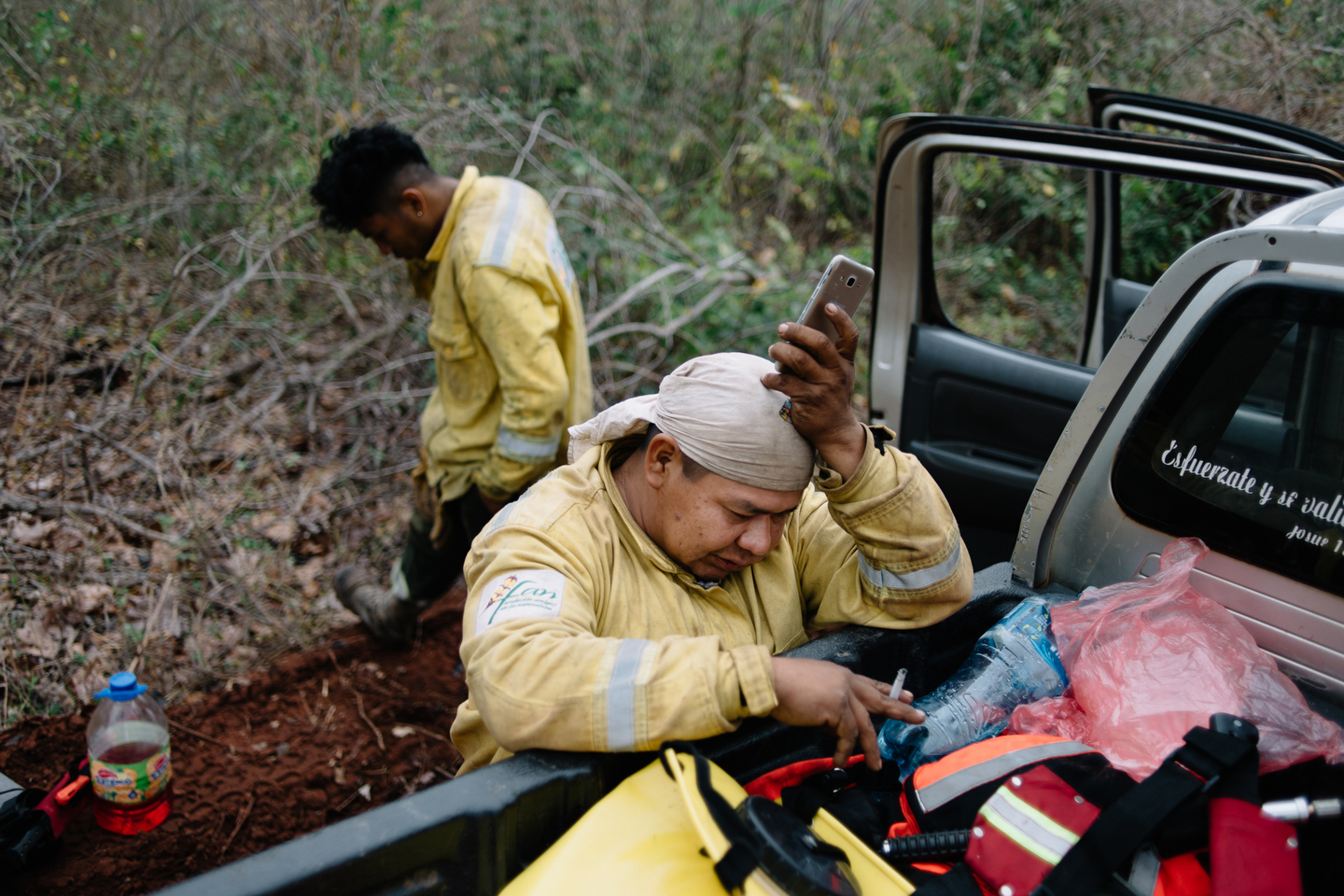Poma no bolea ni fuma cuando está de servicio, «la norma me prohíbe consumir cualquier sustancia», debe cuidar de sus hombres. Por eso ahora, en plena noche cerrada, vamos en la camioneta del pueblo hacia la intersección de dos trochas, donde un grupo de comunarios lleva horas tratando de liquidar el fuego con unos tanques portátiles que llevan en la espalda. Otros emplean motosierras para cortar leños prendidos y enterrar las brasas que han penetrado las raíces de los árboles.